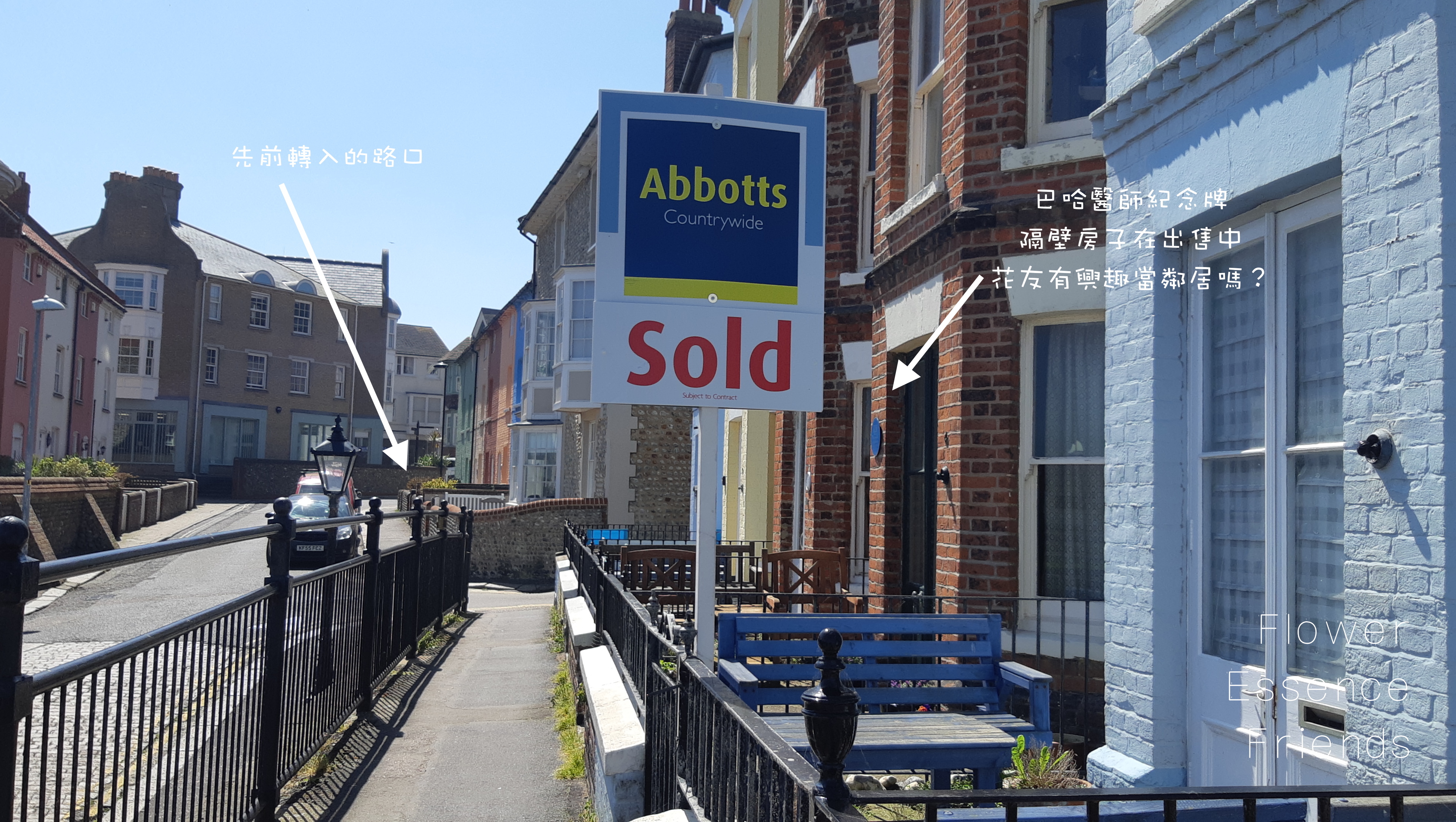 轉角後請看左邊那一排房子,就會看到中間某一棟就藍色圓牌,主持人在這邊獻上幾滴台灣帶去的巴哈花精,當然也有跟圓牌拍合照啦!