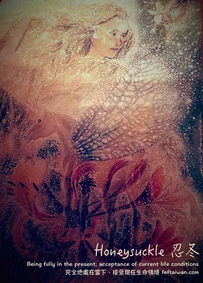 巴哈花精挑了這個花是紅色的,紅色這款不是英國原生物品種,黃色的忍冬花代表著仲夏夜之夢浪漫的(luscious woodbine) 像神話中的巫師,但紅色的忍冬花能帶我們離開過去,面向Janus的另一面到未來,而忍冬紅色花瓣包圍著捲曲的白色雄蕊,有如喇叭宣示著當下。