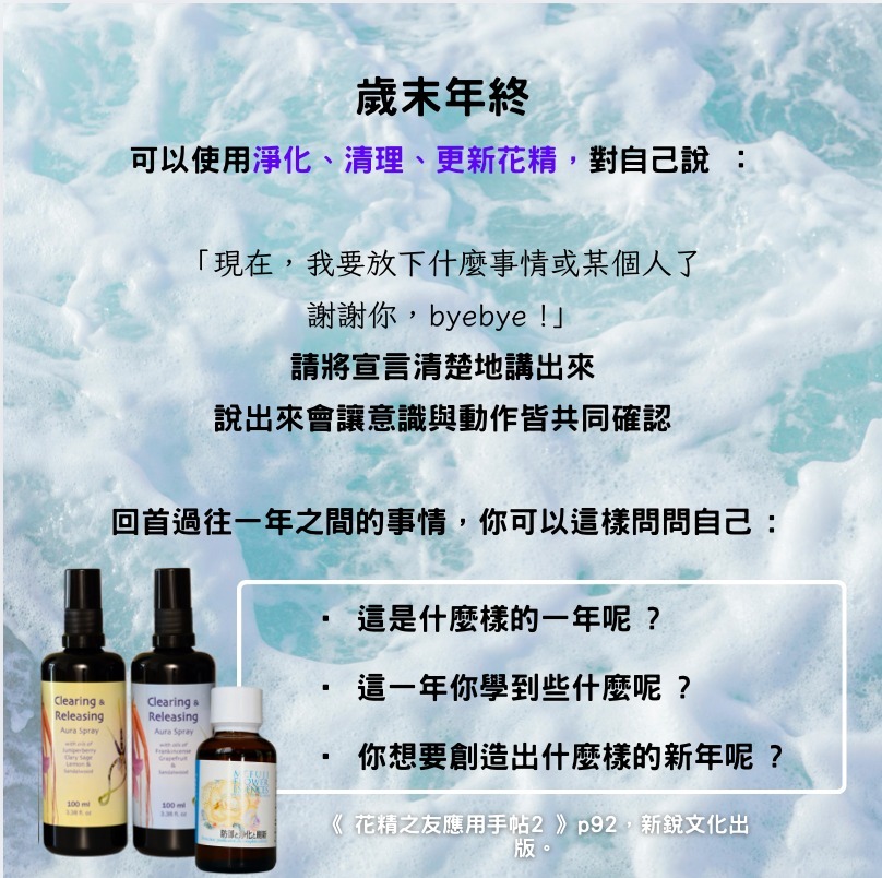 *Aura Cleansing 氣場潔淨:清理氣場並讓氣場煥然一新,適合噴灑或泡澡