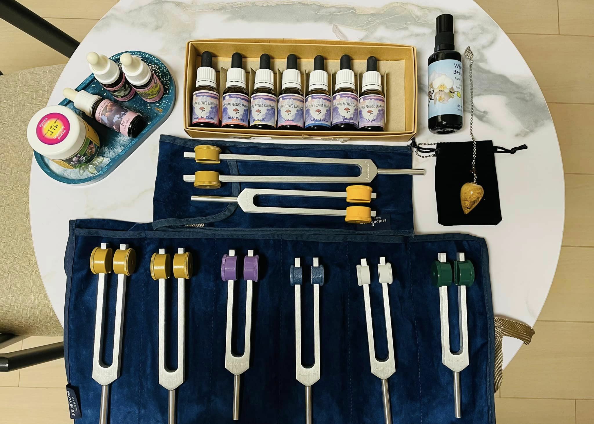 在療程開始之前搭配花精先調整好脈輪通暢度,讓之後的音叉療法身體液能與體腔共鳴更容易一起振動,音叉聲音穿透全身,鬆開許多工作中累積的壓力,雖然在開啟、清理跟補氣的幾個點感覺到為通,但兩三次音叉振動後就解除了。