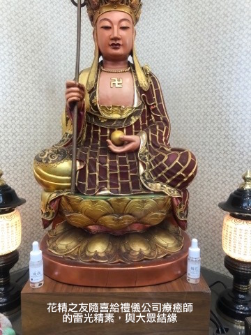 「雷光風水精素」當中可選用「慈愛水滴」、「放我」等精素可滴在病人或臨終後大體的周圍,會讓臨終空間與周遭的人安定,幫助靈體也能穩定分離肉體的過程。