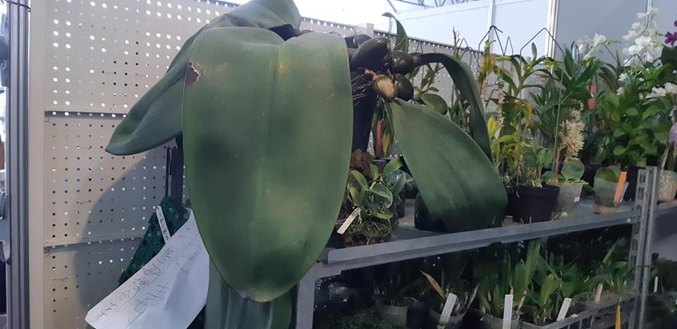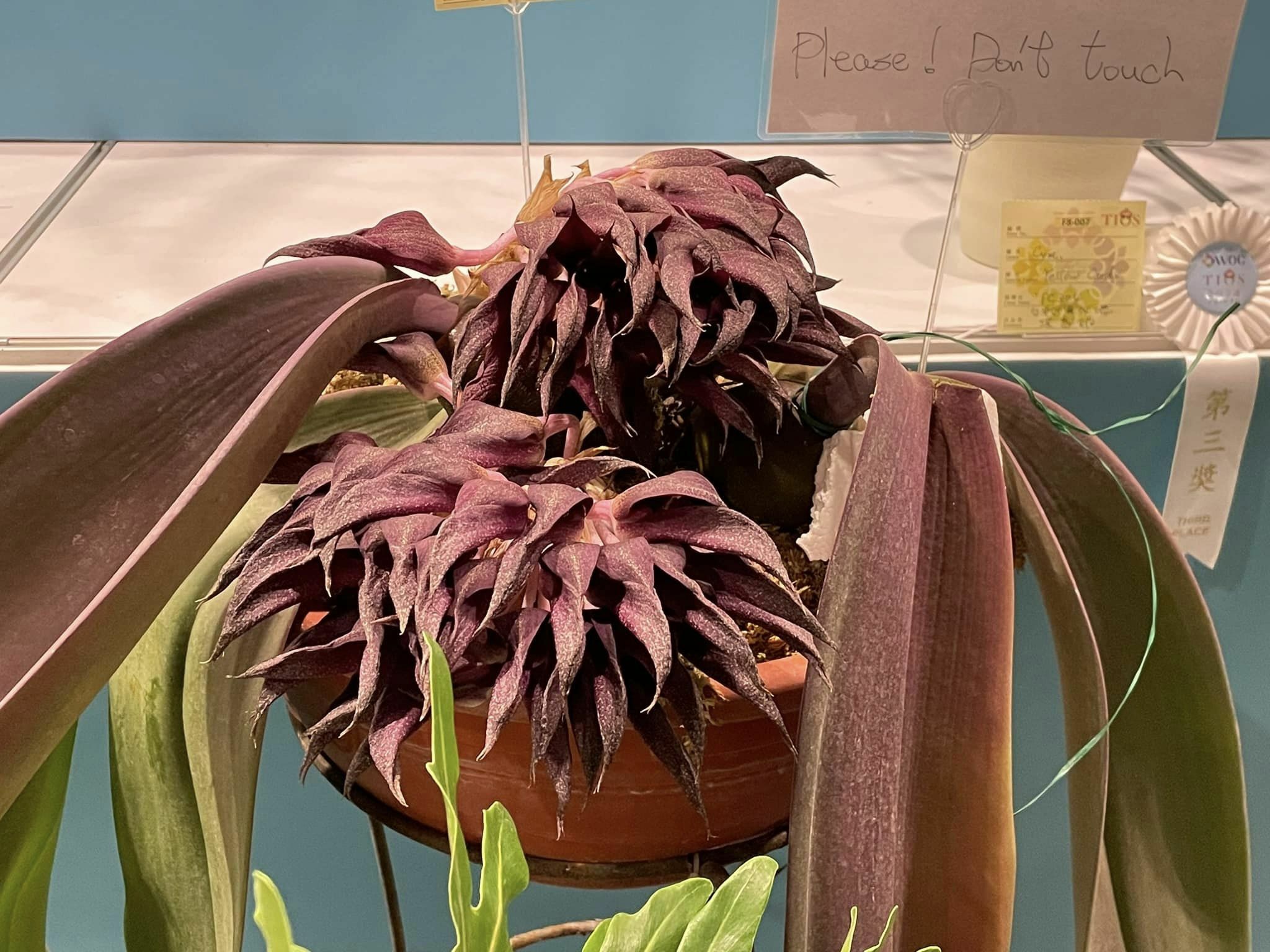 又在蘭花園攤位上,見到去年同樣的領帶蘭(shadow warrior 陰影戰士),老闆又寫這樣「有巨毒」標語了,前往跟老闆聊天,也看到領帶蘭的葉子已經有被摸壞(遺憾)。主持人向老闆請教一下這株豆蘭如何養(去年買了一盆tiny baby orchid,緩慢長葉中),老闆婉轉地還早再養十幾年吧!還再次提到花朵味道頗微妙....然後一顆中型豆分株是一萬元台幣起跳。母親那株好好地待在台中大坑口,這次派第二代出來參展。