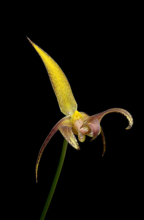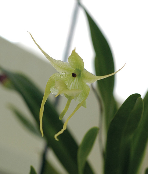 分布於安地斯山脈、厄瓜多及哥倫比亞一代的龍蘭屬植物,約有100~150個不同種類,最大特色就是極為發達的三片萼片、基部生在一起形成甜筒狀構造,當中就是最重要的蕊柱,蕊柱兩側突起小點是退化的花瓣。