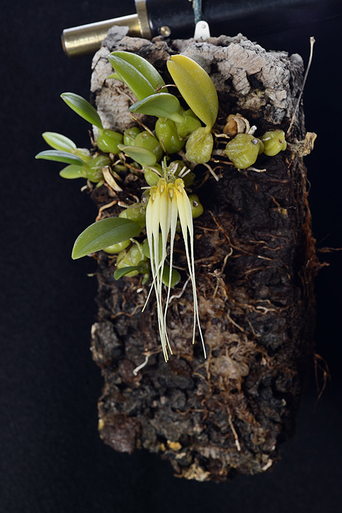 這個豆蘭是很小型、在溫暖地方生長的蘭花,從台灣到越南都可發現,花朵是橘色約8公分長,葉子約5公分,在溫室中若尚未開花,訪客們幾乎不會注意照這株豆蘭,即使開了花也是很羞怯的樣子。