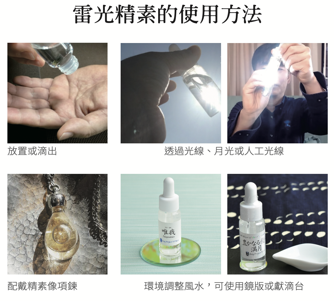 最基本的使用方法之一。打開瓶蓋,手掌微屈成一個凹洞,將雷光環境精素滴在掌中,將兩手摩擦混合,把力量放掉暫時放鬆一下。可以更進一步探索,由你的掌心到身體周圍的空間,也可以試著花些時間探索你的內在。
