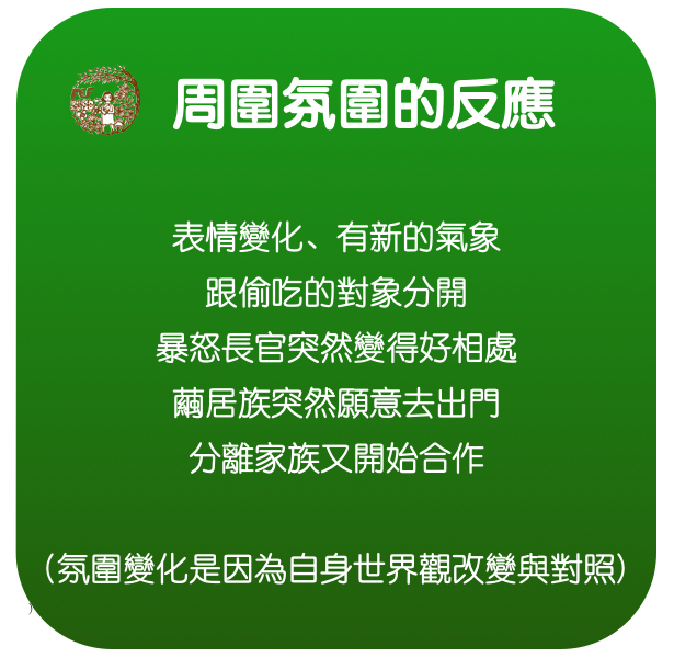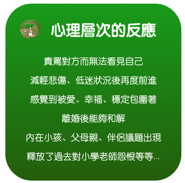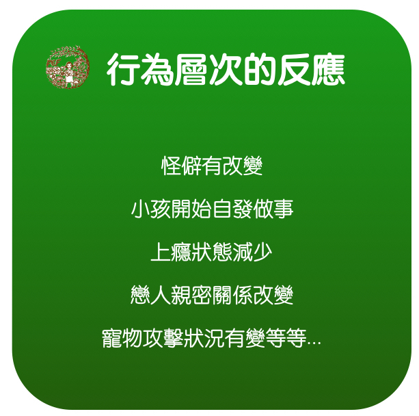 富士山花精製作者 - 中澤厚子老師特別提醒花友們可溫柔地將這些反應當作自己正朝向深究生命主題的「徵兆」,不要忙著逃走。中澤老師統整使用花精後可能有下列9種層次的反應: