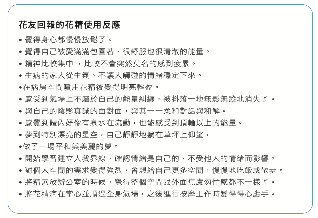 花精之友彙整花友的多年回饋心得,常見的反應有:身體狀態改變、情緒起伏、夢境湧現,或是外部事件發生等等。這些不同以往的反應通常是在使用花精後的幾天內或兩周內會出現,這些反應就像在清理老舊水管一樣 ,是身體能量在更新的過程。