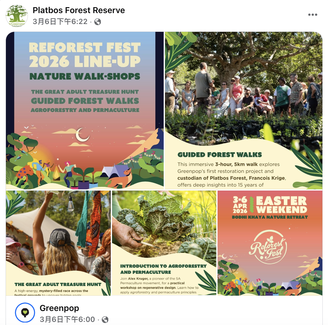 Platbos非洲大樹中心在森林中自給自足,使用太陽能與其他持續能量來源的動力,盡可能和諧與永續生活在地球上,並持續進行相關復育與教育活動、造林計畫。 布拉伯森林每年春天都與當地環保團體 Greenpop 、Bodhi Khaya 合作舉辦「植樹祭」,直至2023年已經在這個南非腳森林,種下了10萬多棵樹。