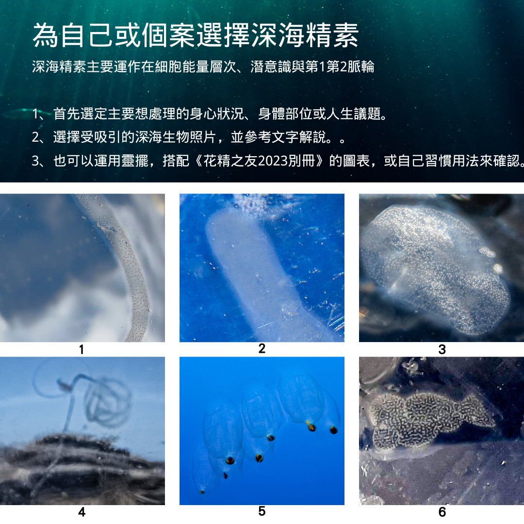 深海生物們的生活方式和習慣令人著迷,他們通常會從海洋深處上升到水面,在黎明第一縷陽光開始照亮水面時,再度回到了海洋深處。這個模式也代表著深海精素的「主旋律」: 揭開細胞意識中深層的無意識障礙、幫助轉化。我們能夠去意識到舊有障礙是什麼,將它們帶到意識層面,就能去轉化與釋放這些障礙。