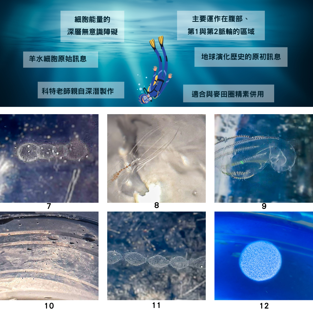 科特老師親自深潛到海中,當他凝視這些深海生物時,深海生物的身體結構讓他想到了很像「神聖幾何」的麥田圈,因此深海精素很適合麥田圈精素的一起併用,將會是全新的使用方法,是創新的振動療法,再結合洲際大地PHI所研發的HLT光療( Holistic Light Treatment)會更有威力。