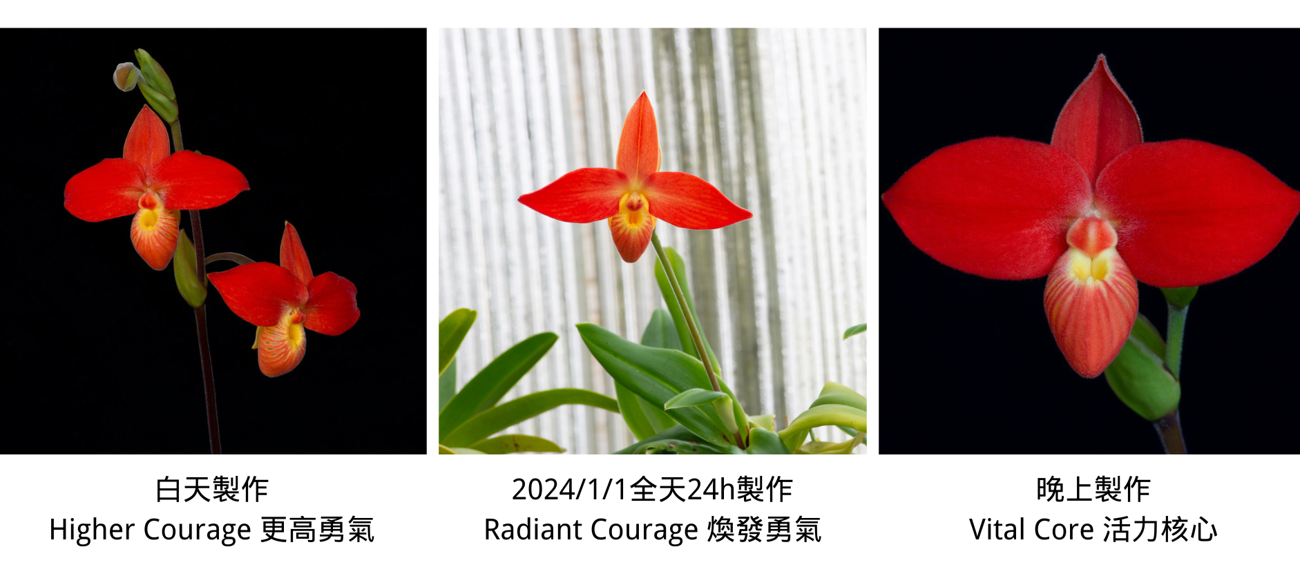 2024年1月1日、製作者Don受到這株蘭花Phrag besseae的呼喚製成了花精,這株蘭花過去已經製作出兩個花精:一個是晚上製作的Vital Core 活力核心,另一個是白天製作的Higher Courage 更高勇氣。而這個新花精「煥發勇氣」製作不同之處,是用了24 小時(1月1日中午~1月2日中午)以浸泡法完成製作。
